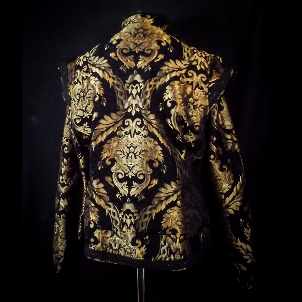 Beautiful black and gold brocade doublet, fully lined with detachable sleeves and button fastenings. Size detail in images