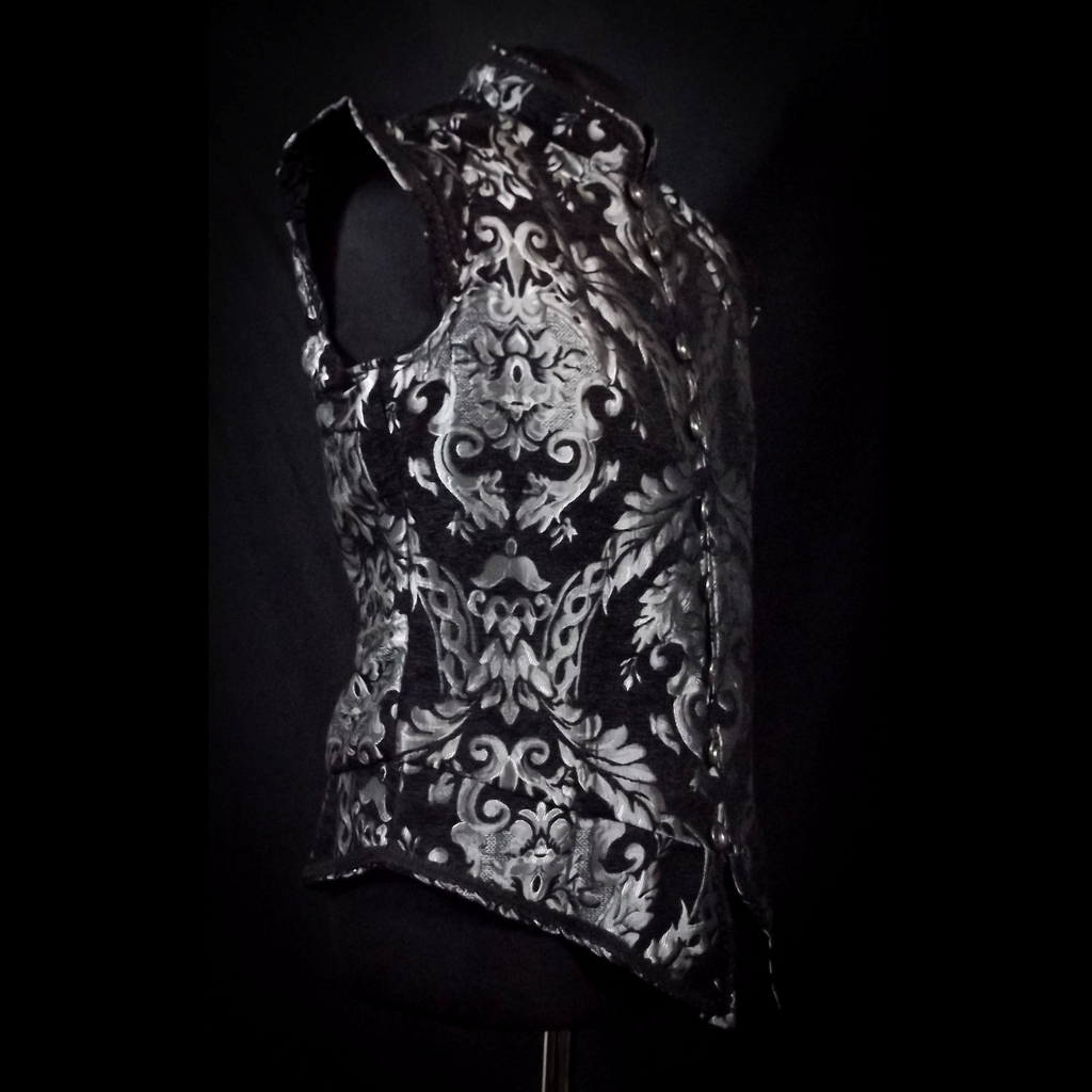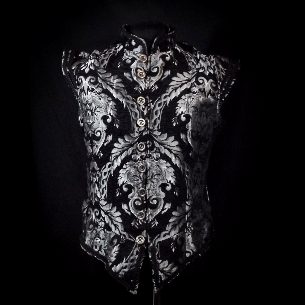 Beautiful black and silver brocade singlet, fully lined with  button fastenings. Size detail in images