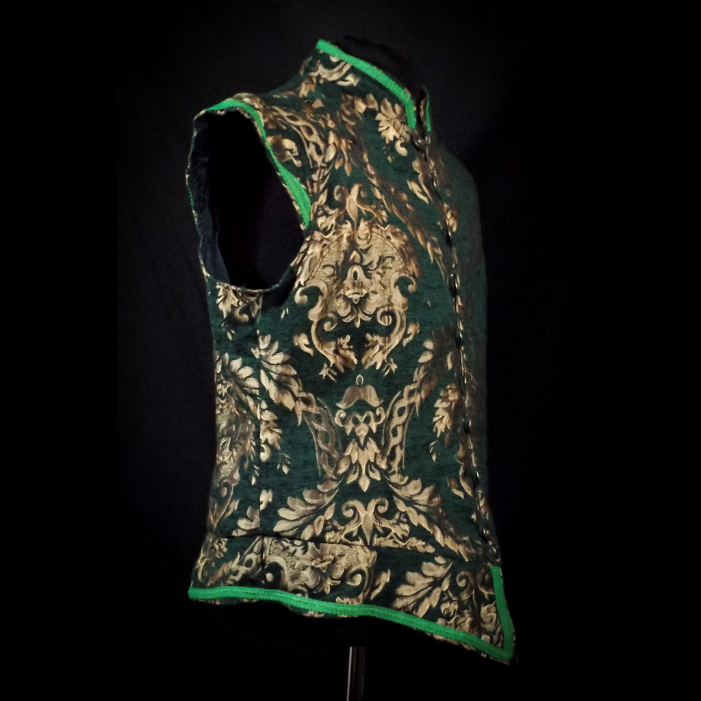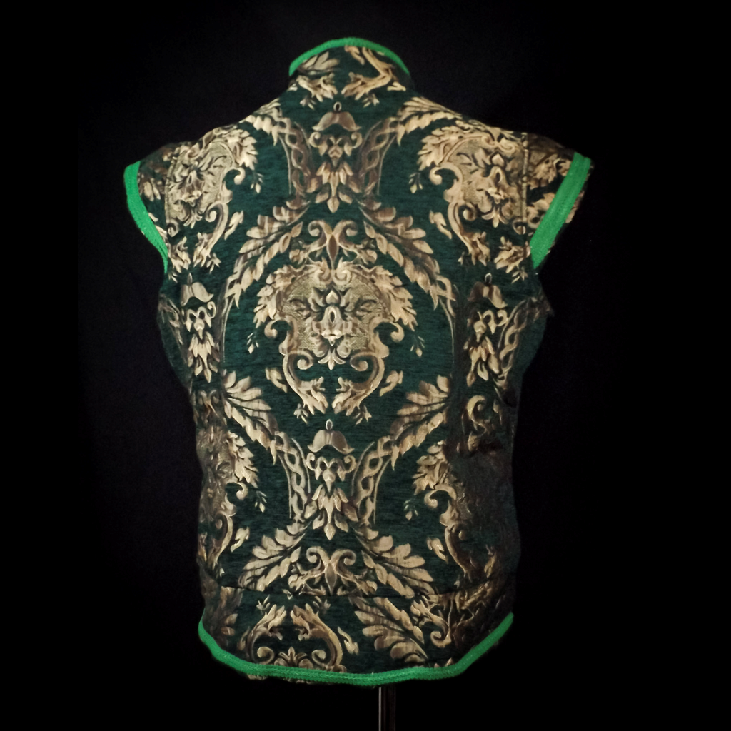 Beautiful green and gold brocade singlet, fully lined with button fastenings. Size detail in images