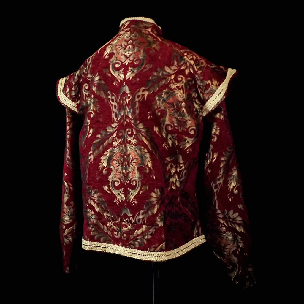 Beautiful red and gold brocade doublet, fully lined with detachable sleeves and button fastenings. Size detail in images