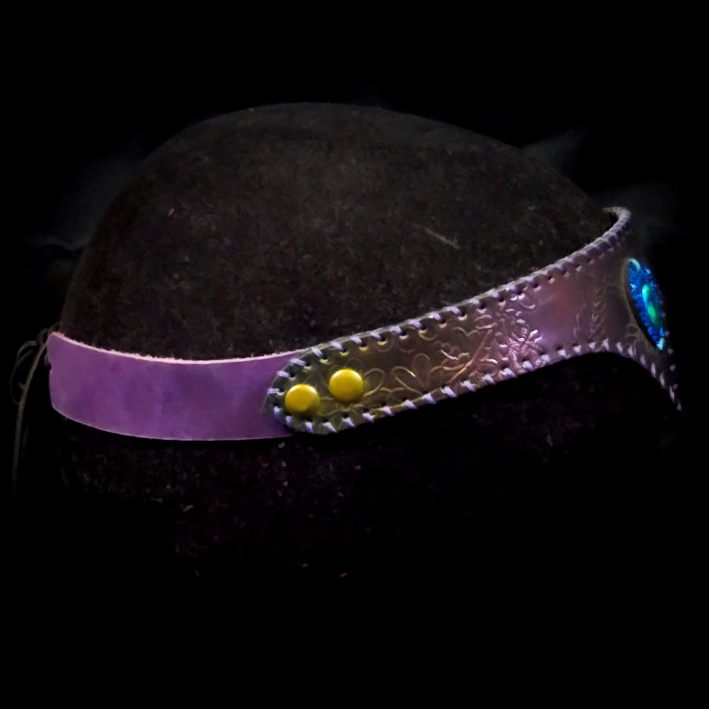 Handmade leather & craft fabric circlet with central feature decoration. Comes with elastic tie at the back to fit most adults.