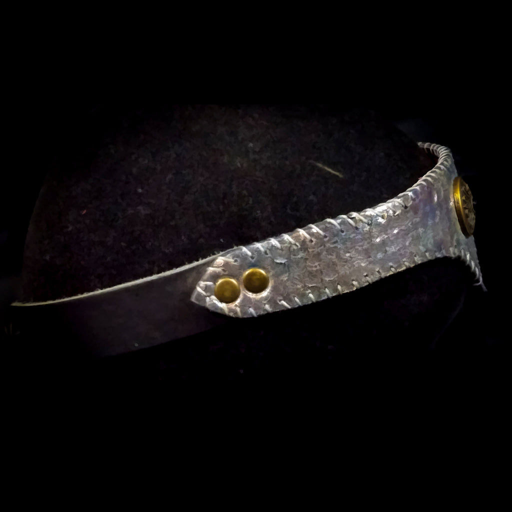 Handmade leather circlet with central feature decoration. Comes with elastic tie at the back to fit most adults.